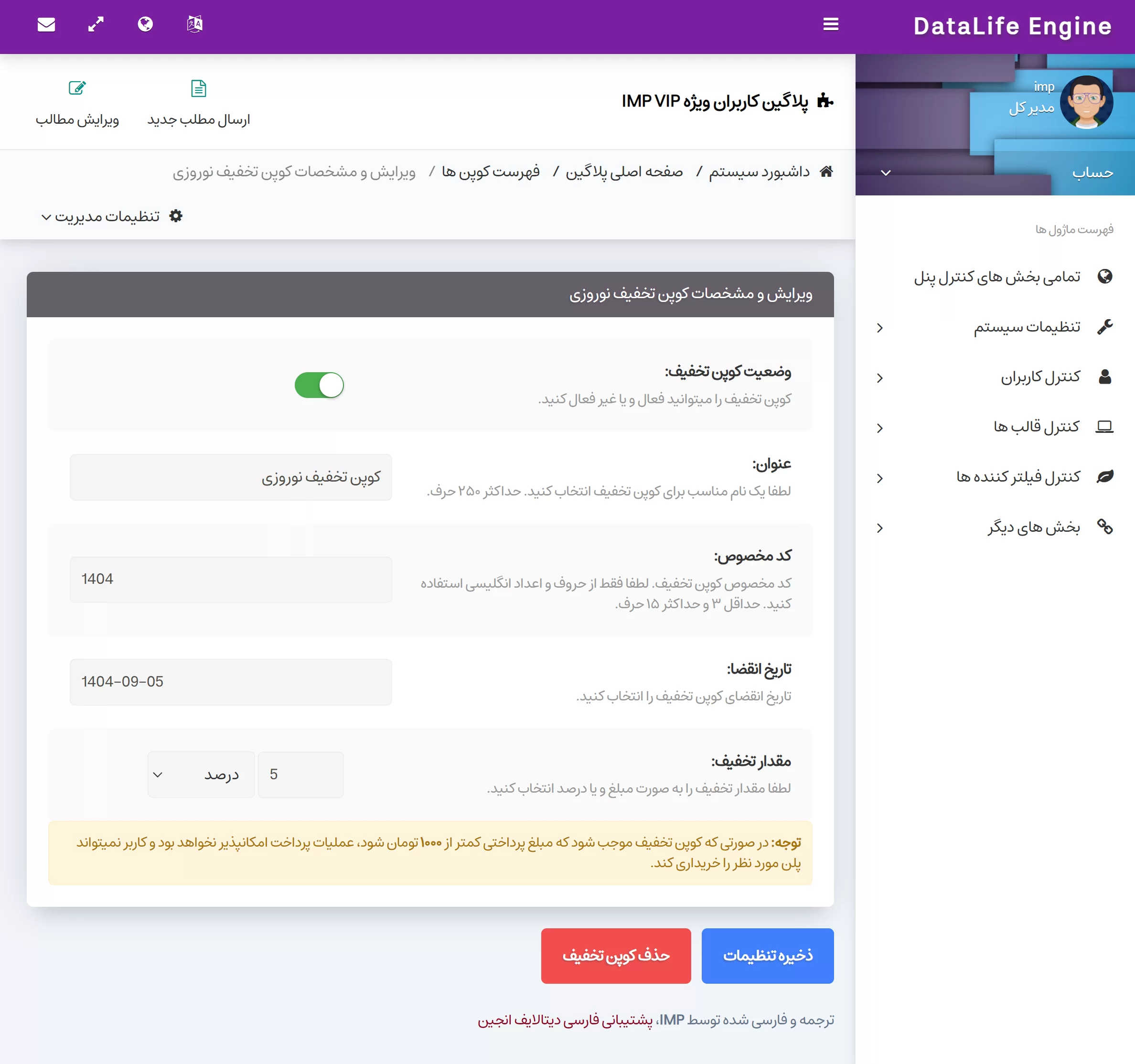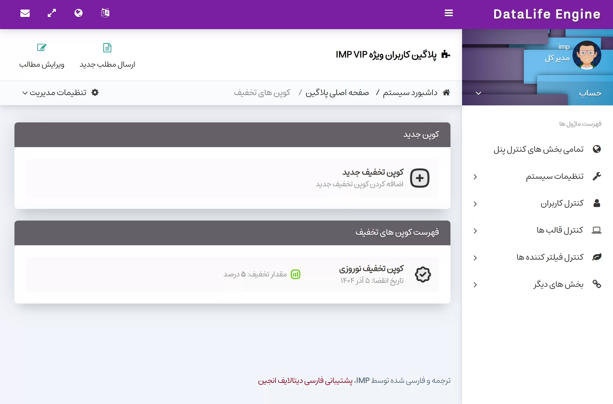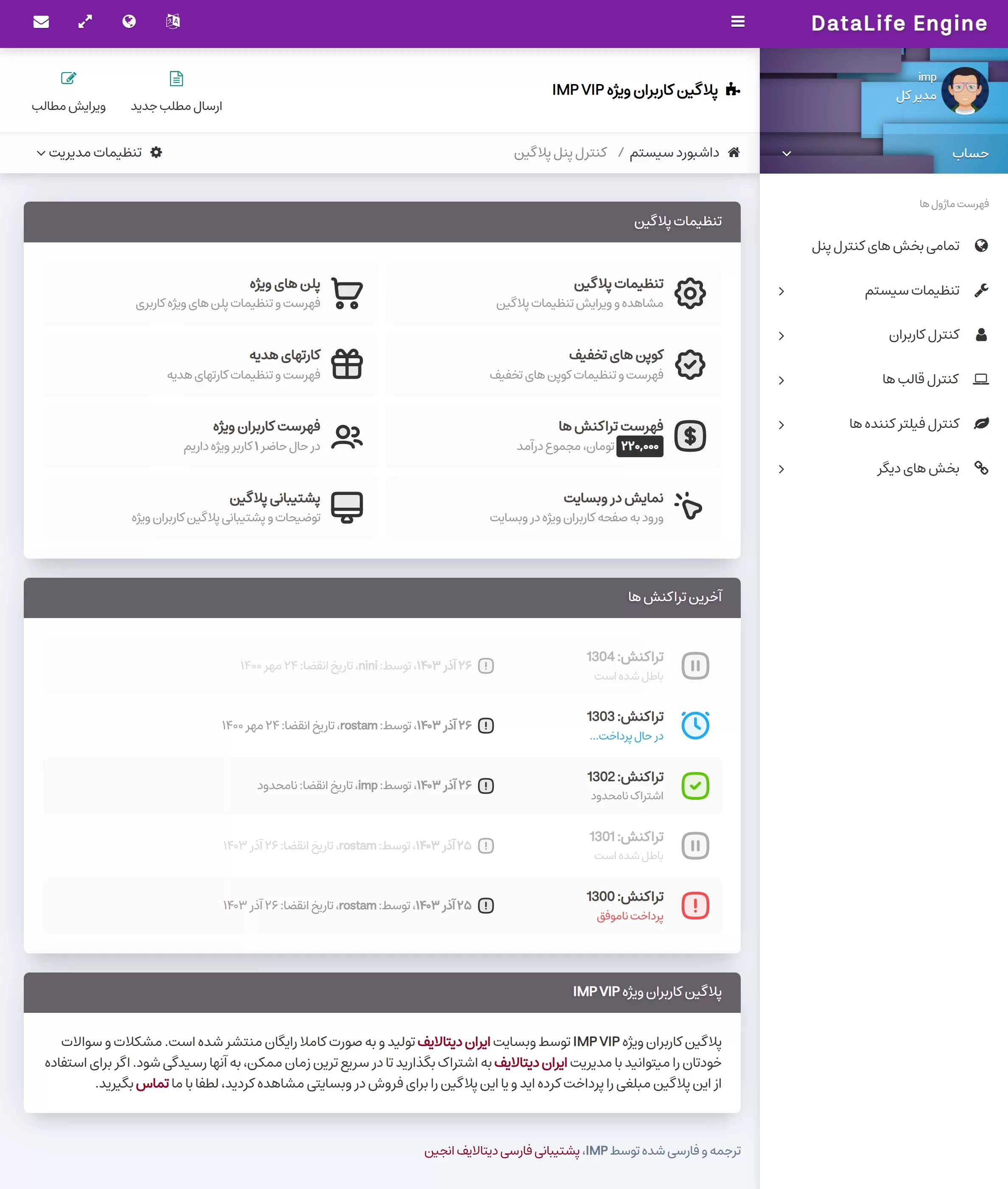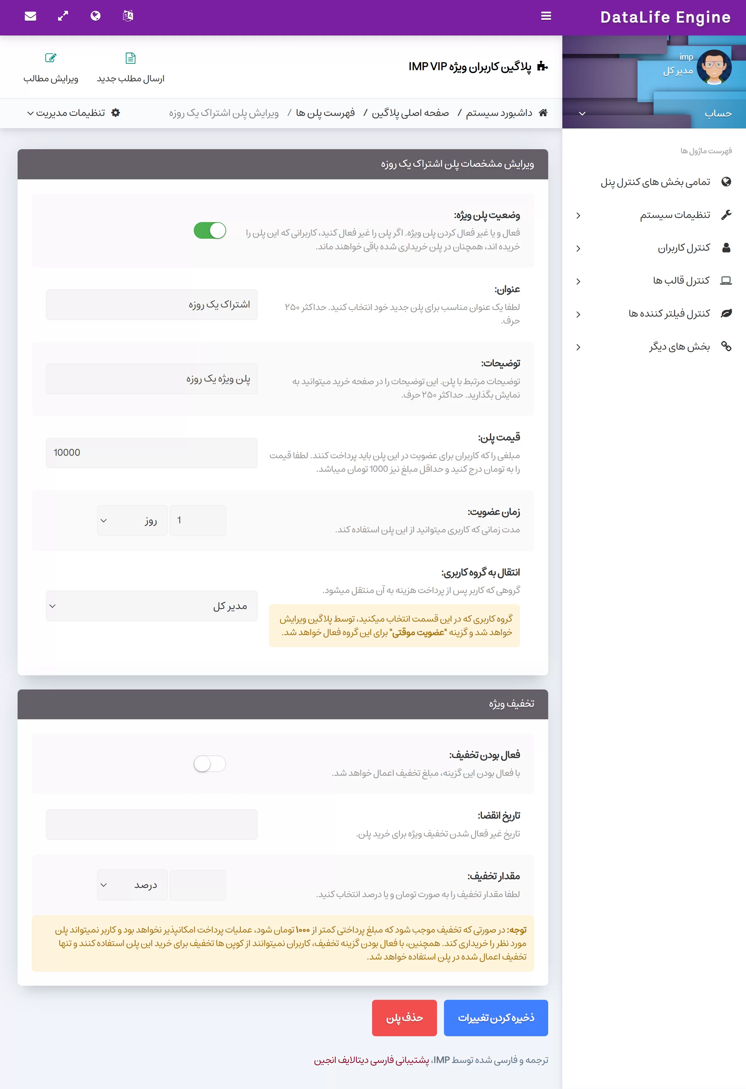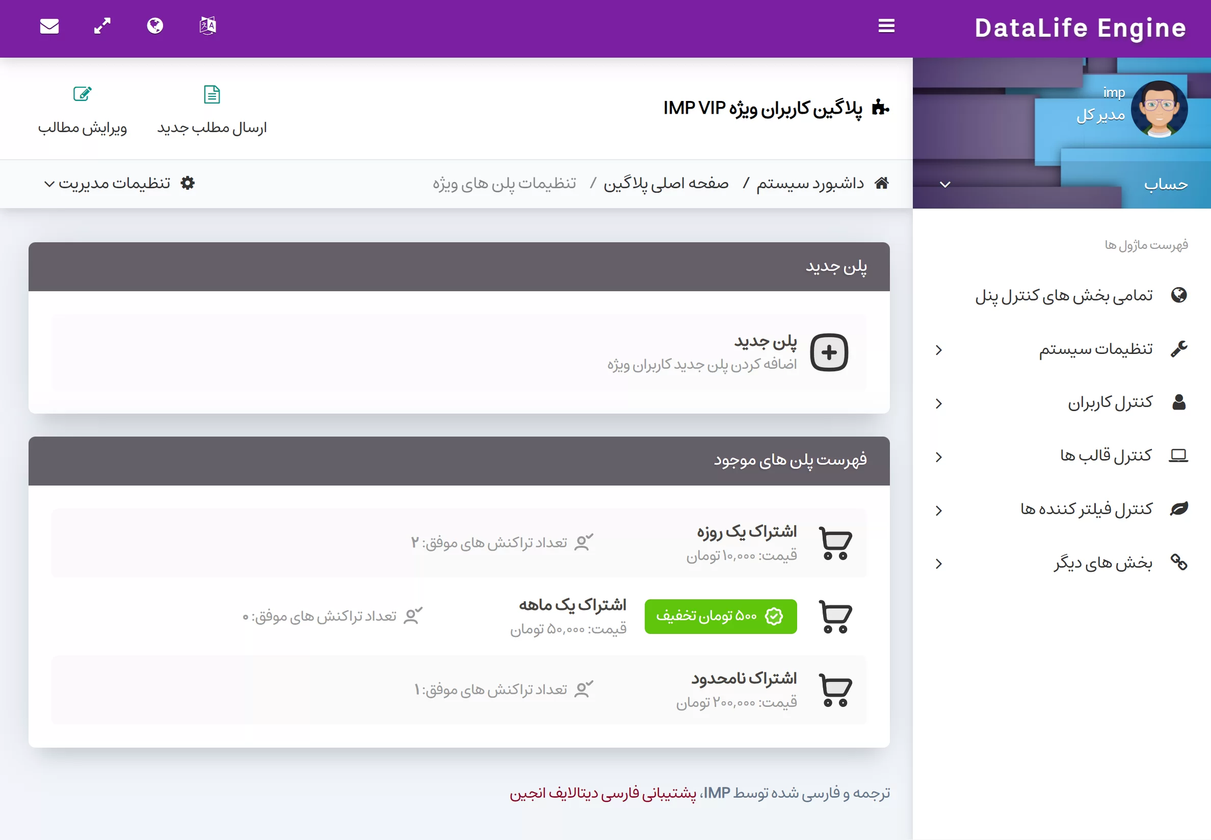 پلاگین جدید IMP VIP جدیدترین پلاگین منتشر شده به صورت رایگان توسط ایران دیتالایف میباشد. با کمک این پلاگین میتوانید در وبسایت خود اقدام به فروش پلن های ویژه کاربری نمایید. مختصری از امکانات این پلاگین را در ادامه مرور خواهید کرد: