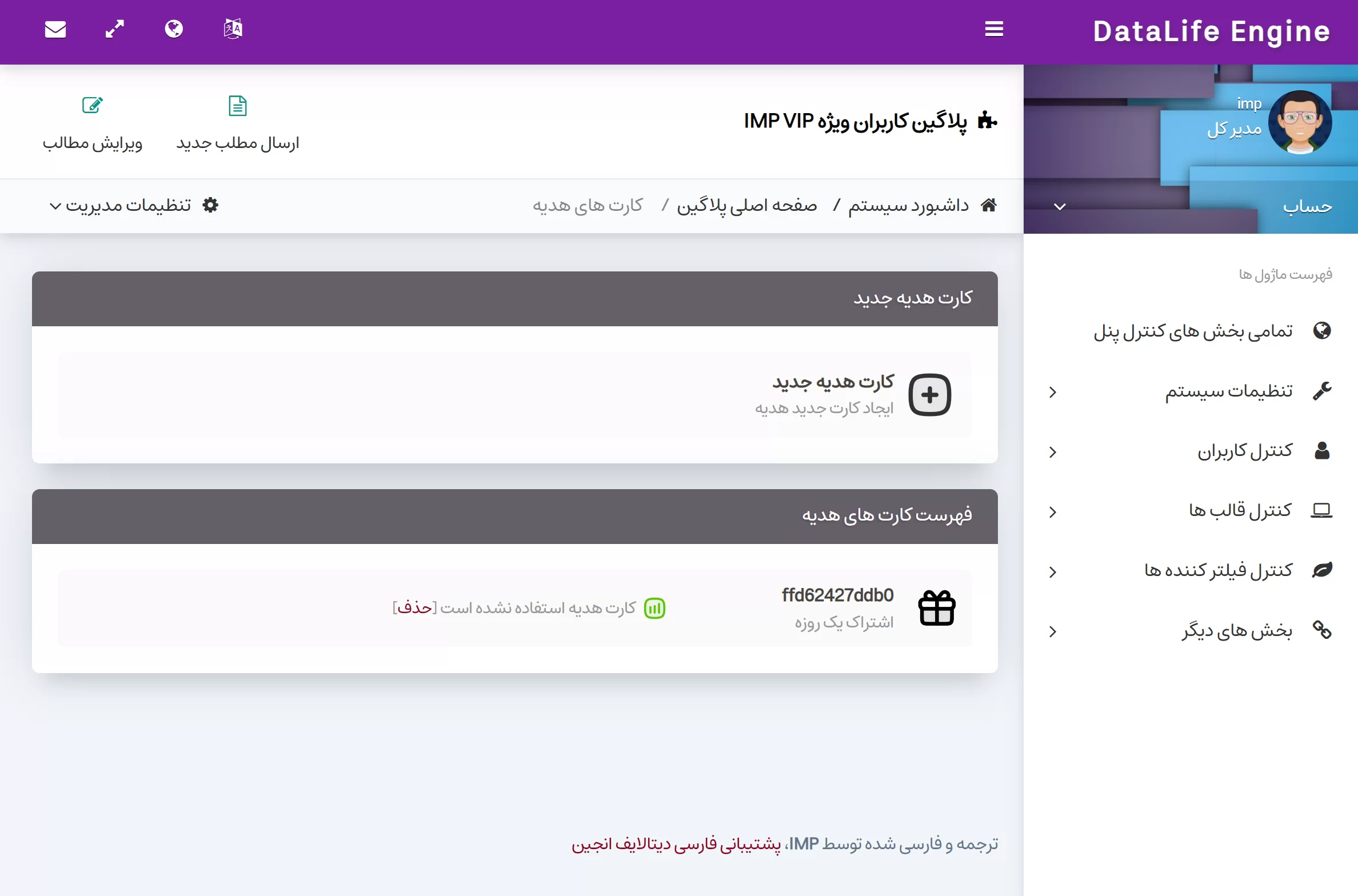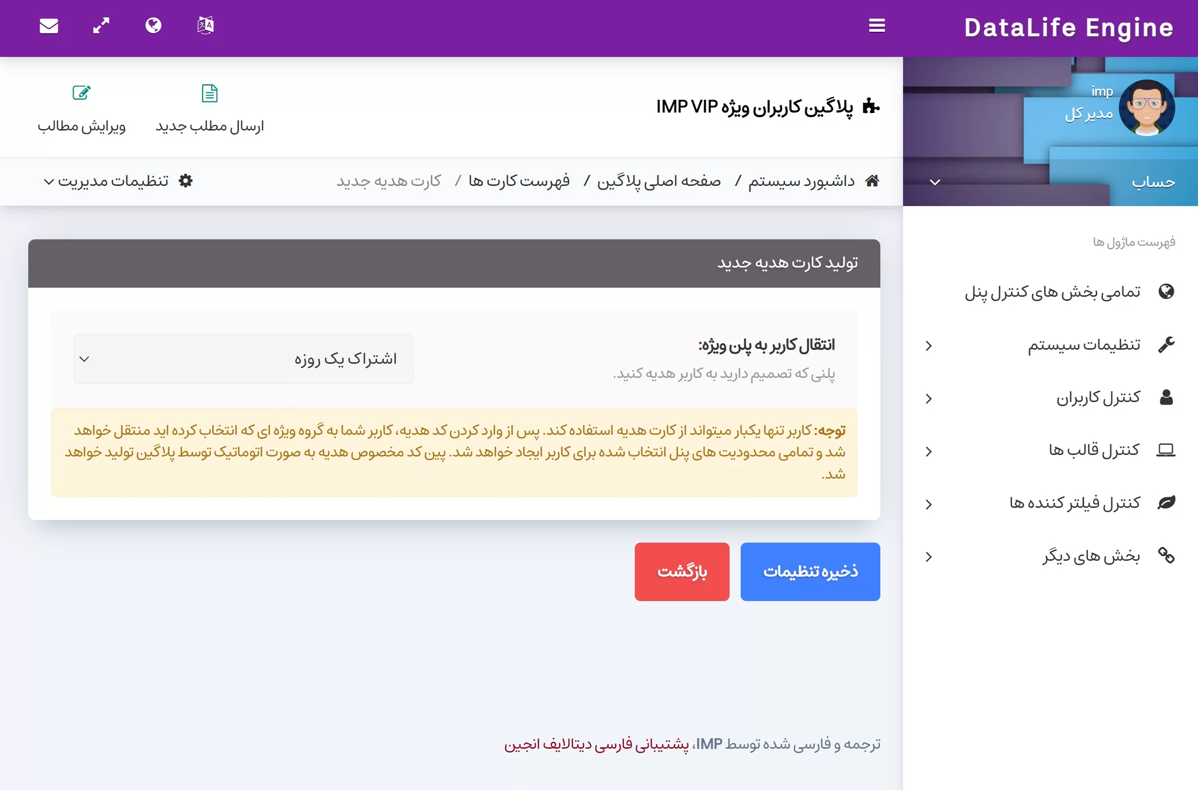 • قابلیت ایجاد کارت هدیه و انتقال کاربر به پلن مورد نظر به صورت رایگان.