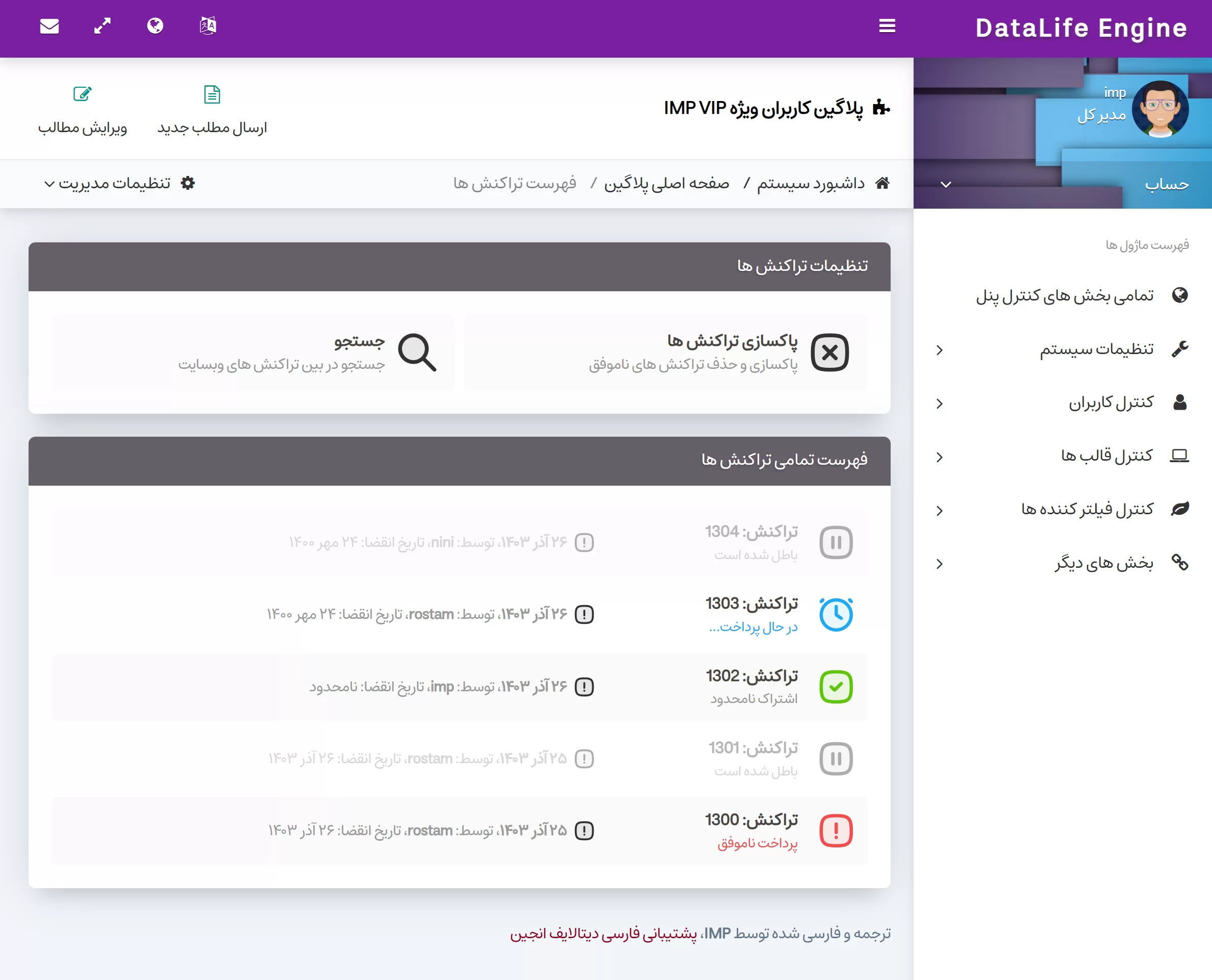 • نمایش فهرست تراکنش های صورت گرفته در پنل مدیریت.